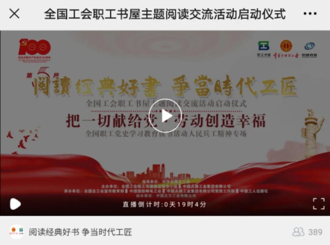 又到一年世界讀書日,激蕩在全國職工朋友心中的“閱讀經(jīng)典好書 爭當(dāng)時(shí)代工匠”又一次在神州大地叫響。今年,“把一切獻(xiàn)給黨 勞動(dòng)創(chuàng)造幸福”成為了閃亮的主題,在億萬職工中掀起心潮。 今天(4月23日)下午 15:00,第五屆“閱讀經(jīng)典好書 爭當(dāng)時(shí)代工匠”全國工會(huì)職工書屋主題閱讀交流活動(dòng)啟動(dòng)儀式暨“把一切獻(xiàn)給黨·勞動(dòng)創(chuàng)造幸福”全國職工黨史學(xué)習(xí)教育讀書活動(dòng)人民兵工精神專場隆重開啟! 多項(xiàng)閱讀計(jì)劃同場發(fā)布、多本經(jīng)典好書現(xiàn)場推薦、多位職工誦讀演繹紅色經(jīng)典、勞模代表進(jìn)行閱讀分享和倡議,讓我們共同在閱讀中感悟紅色經(jīng)典,在活動(dòng)中傳承精神力量。 這一年一度的全國職工閱讀盛典,你還在等什么! 看!在建黨百年的歷史節(jié)點(diǎn),職工現(xiàn)場誦讀紅色經(jīng)典《把一切獻(xiàn)給黨》,傳承以吳運(yùn)鐸為代表的人民兵工精神,感悟經(jīng)典的魅力和信仰的力量。 聽!來自兵器工業(yè)集團(tuán)的全國勞模代表在現(xiàn)場,向廣大職工朋友發(fā)出閱讀倡議。分享在黨的領(lǐng)導(dǎo)下,大國重器由跟仿跟研到世界領(lǐng)先的蛻變。 來!聚焦現(xiàn)場,正式啟動(dòng)第五屆“閱讀經(jīng)典好書 爭當(dāng)時(shí)代工匠”全國工會(huì)職工書屋主題閱讀交流活動(dòng),同時(shí)點(diǎn)亮專屬人民兵工精神的火炬,讓閱讀熱情傾力綻放。 40余家省級工會(huì)新媒體 100余家市級工會(huì)新媒體 200余家知名企業(yè)工會(huì)新媒體 同步直播 精彩即將上演 直播在哪看? STEP1 關(guān)注全總職工書屋微信號 點(diǎn)擊下方菜單欄-活動(dòng)專區(qū) 觀看直播啦 還可以同步觀看圖片直播 記錄下每個(gè)精彩時(shí)刻 |