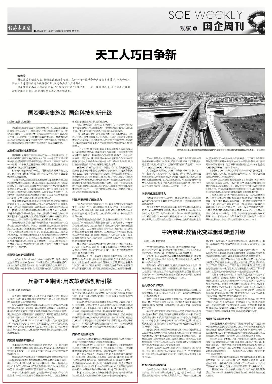 近日,中國兵器工業(yè)集團(tuán)有限公司國企改革三年行動的經(jīng)驗做法和工作成效引發(fā)媒體廣泛關(guān)注。中國新聞社、中國網(wǎng)、工人日報客戶端、光明日報客戶端、新華財經(jīng)、國資報告、人民網(wǎng)、國資委網(wǎng)站、人民政協(xié)網(wǎng)、《證券日報》、學(xué)習(xí)強(qiáng)國平臺、央廣經(jīng)濟(jì)之聲、第一財經(jīng)客戶端、新華社、《經(jīng)濟(jì)參考報》、海外網(wǎng)、中工網(wǎng)、騰訊網(wǎng)、新浪網(wǎng)、搜狐網(wǎng)、網(wǎng)易網(wǎng)等中央主流媒體、國家部委網(wǎng)站及知名網(wǎng)絡(luò)媒體對集團(tuán)公司國企改革三年行動情況進(jìn)行了刊載報道。 中國新聞社:兵器工業(yè)集團(tuán):國企改革三年行動156項改革舉措2021年底已完成90%以上 中國網(wǎng):兵器工業(yè)集團(tuán)“四個堅持”促改革 成效顯著 中國網(wǎng):兵器工業(yè)集團(tuán)體系化推進(jìn)民品發(fā)展戰(zhàn)略 布局17個重點產(chǎn)業(yè)領(lǐng)域 工人日報客戶端:兵器工業(yè)集團(tuán)國企改革三年行動取得顯著成效 光明日報客戶端:兵器工業(yè)集團(tuán)國企改革三年行動成效顯著 新華財經(jīng):兵器工業(yè)集團(tuán)三年行動見實效 國資報告:聚焦高水平自立自強(qiáng),兵器工業(yè)集團(tuán)深化體制機(jī)制變革成效顯著 人民網(wǎng):“國企改革三年行動”系列報道——三項制度改革進(jìn)一步走深走實 國有企業(yè)活力動力明顯增強(qiáng) 國資委網(wǎng)站:【對標(biāo)世界一流 央企加速奔跑】兵器工業(yè)集團(tuán)國企改革三年行動成效顯著 人民政協(xié)網(wǎng):兵器工業(yè)集團(tuán)改革舉措走深走實 創(chuàng)新激發(fā)企業(yè)活力 《證券日報》:一季度17家央企控股上市公司實施股權(quán)激勵 業(yè)績印證激勵實效 學(xué)習(xí)強(qiáng)國平臺:兵器工業(yè)集團(tuán)國企改革三年行動成效顯著 第一財經(jīng)客戶端:國企改革三年行動攻堅沖刺,中長期激勵有望深層次突破 新華社、《經(jīng)濟(jì)參考報》:國企改革三年行動迎考 混改上市動作頻頻 中長期激勵擴(kuò)圍升級 《證券日報》:年內(nèi)8家國有控股公司登陸A股 39家排隊中 《經(jīng)濟(jì)參考報》:兵器工業(yè)集團(tuán):用改革點燃創(chuàng)新引擎 |