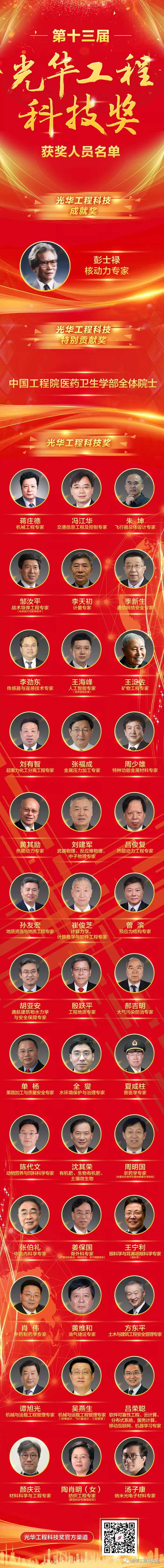11月8日,第十三屆光華工程科技獎(jiǎng)揭曉儀式在北京隆重舉行。中國(guó)兵器工業(yè)集團(tuán)有限公司科技委副主任委員、戰(zhàn)術(shù)導(dǎo)彈工程專家鄒汝平獲第十三屆光華工程科技獎(jiǎng)(獲獎(jiǎng)人員全名單及鄒汝平事跡附后)。 光華工程科技獎(jiǎng)由中國(guó)工程院主管,每?jī)赡觐C發(fā)一次,目前已是第十三屆,被譽(yù)為“中國(guó)工程界最高獎(jiǎng)項(xiàng)”,極大地激勵(lì)了我國(guó)工程師、科學(xué)家從事工程科技研究、發(fā)展、應(yīng)用的積極性和創(chuàng)造性。根據(jù)光華工程科技獎(jiǎng)候選人提名要求,候選人需在重大工程設(shè)計(jì)、研制、建造、生產(chǎn)、運(yùn)行、管理等方面解決關(guān)鍵科學(xué)技術(shù)問題或在工程科學(xué)技術(shù)及工程管理領(lǐng)域有重要發(fā)現(xiàn)、發(fā)明,并有顯著應(yīng)用成效,或者是應(yīng)用本人研究成果、發(fā)明創(chuàng)造,發(fā)展高新技術(shù)及相關(guān)產(chǎn)業(yè),成效特別顯著者才可提名。今年,全國(guó)范圍內(nèi)共產(chǎn)生了296名有效候選人。 此次揭曉儀式正式公布了從296名候選人中評(píng)選出的第十三屆光華工程科技成就獎(jiǎng)、光華工程科技特別貢獻(xiàn)獎(jiǎng)以及光華工程科技獎(jiǎng)的獲得者,最終僅有40位專家和1個(gè)團(tuán)體獲獎(jiǎng)。本屆光華工程科技獎(jiǎng)的獲獎(jiǎng)科學(xué)家們,緊密圍繞國(guó)家重大戰(zhàn)略需求,瞄準(zhǔn)經(jīng)濟(jì)建設(shè)和事關(guān)國(guó)家安全的重大工程科技問題,緊貼新時(shí)代社會(huì)民生現(xiàn)實(shí)需求和軍民融合需求,加快自主創(chuàng)新成果轉(zhuǎn)化應(yīng)用,為創(chuàng)新驅(qū)動(dòng)發(fā)展,建設(shè)科技強(qiáng)國(guó),以及實(shí)現(xiàn)“兩個(gè)一百年”奮斗目標(biāo)和中國(guó)夢(mèng)做出了重要貢獻(xiàn)。 獲獎(jiǎng)人員全名單 來源/光華工程科技獎(jiǎng) |