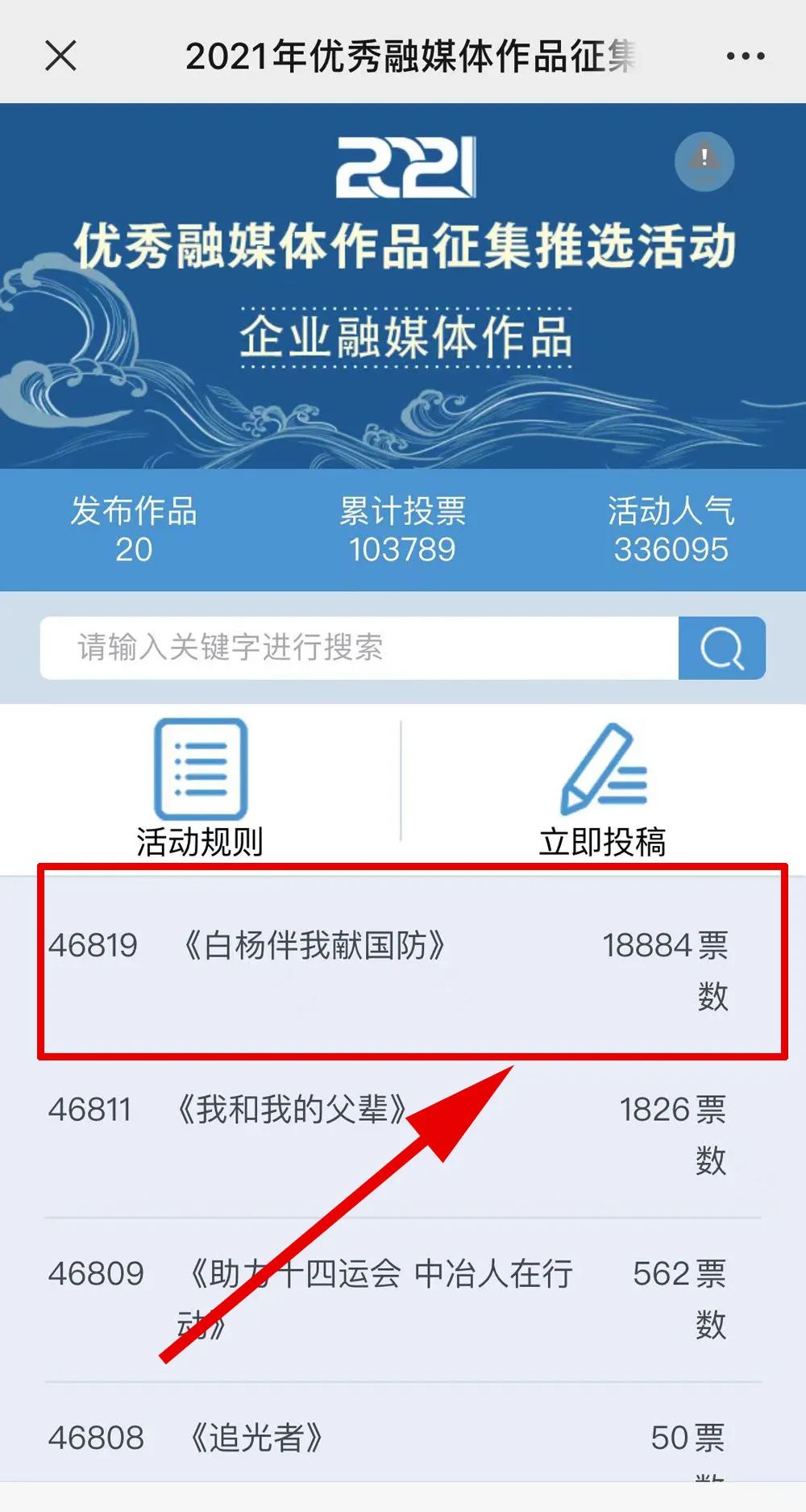近日,由“文化強國”光明日報協(xié)同推廣平臺、光明網(wǎng)、北京師范大學新媒體傳播研究中心和光明天翼5G融媒實驗室共同主辦的“2021年優(yōu)秀融媒體作品征集推選活動”開啟線上投票環(huán)節(jié),經(jīng)過專家委員會評審,中國兵器工業(yè)集團北重集團《白楊伴我獻國防》音樂MV入選活動前二十名,并進入網(wǎng)絡投票環(huán)節(jié)。 《白楊伴我獻國防》 楊樹參天 高聳云端的是兵工人 “履行好強軍首責”的壯志凌云! 深植北疆 傾獻沃土的是北重人 “推動高質(zhì)量發(fā)展”的壯志豪情! 白楊樹伴著我們茁壯成長 見證著我們獻身國防! 投票方式 1.掃描下方二維碼,進入初始界面,點擊“企業(yè)融媒體作品征集”,進入投票界面點擊《白楊伴我獻國防》,點擊“投TA一票”; 2. 每人每日可投10票,直至提示投票達到上限即可; 3.投票時間:2022年3月17日09:00-2022年4月2日17:00。 來源/光明網(wǎng)、北重集團 |